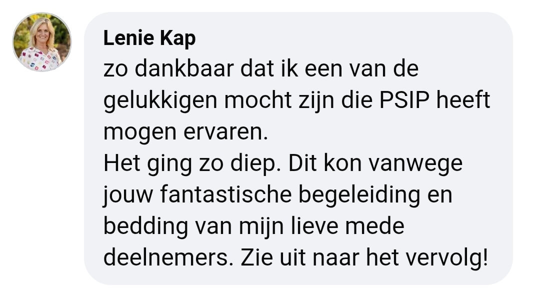 Ook als je je wel bewust bent van vroegkinderlijk of hechtingstrauma, dan nog, en juist dan, zijn herinneringen vaak gefragmenteerd. Er is zoveel dissociatie, zoveel diepe verwondingen waar geen woorden voor zijn. Juist in die lagen werkt PSIP.