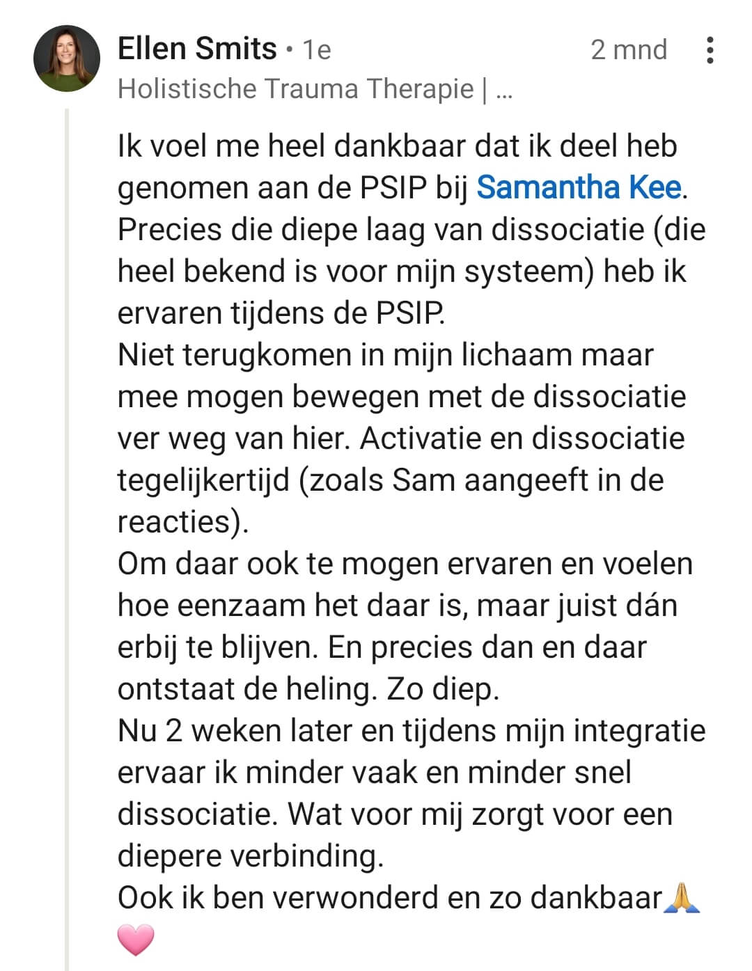 Ik heb geen andere therapie ontdekt waarbij met zulke diepe lagen van dissociatie en (complex) trauma gewerkt kan worden.